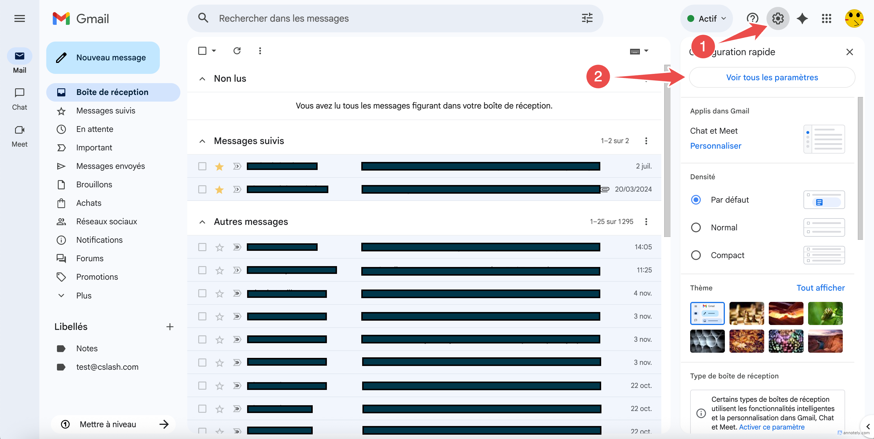 Depuis la page principale de votre compte Gmail, cliquez sur l’icône figurant une roue crantée en haut à droite pour accéder aux Paramètres de votre boîte.