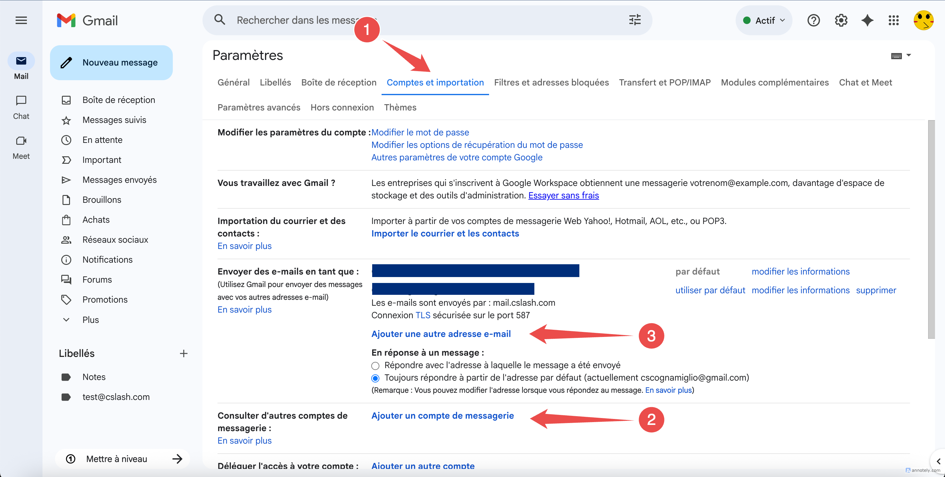 Rendez-vous ensuite dans la section Comptes et importation [1]. Ici vous pouvez ajouter le compte pour consulter l'adresse mail [2] et pour envoyer des emails avec cet adresse. [3]